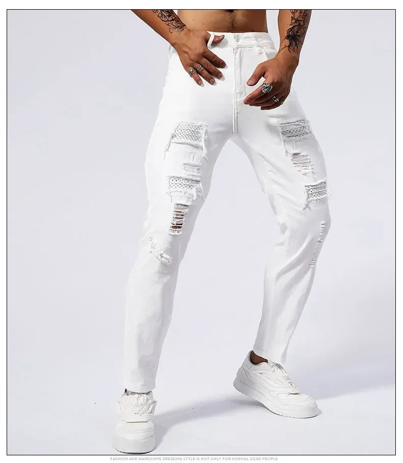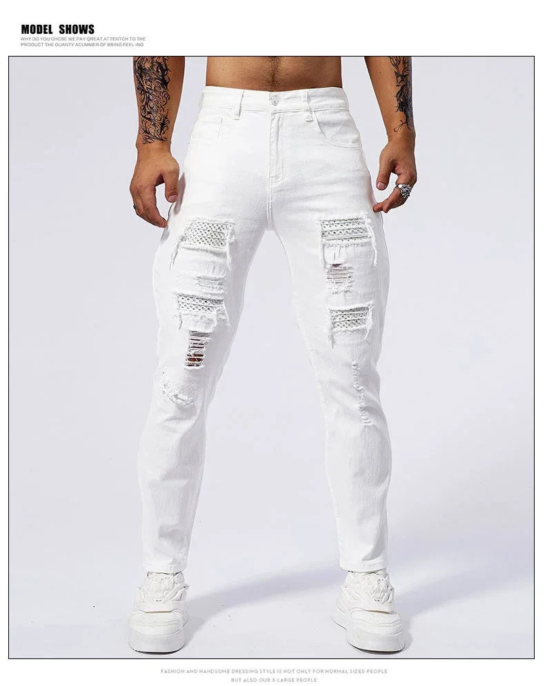 98% Cotton Ripped Slim White Jeans Men High Elasticity Clothing Fashion Small Feet Hip Hop Male Denim Trousers Streetwear