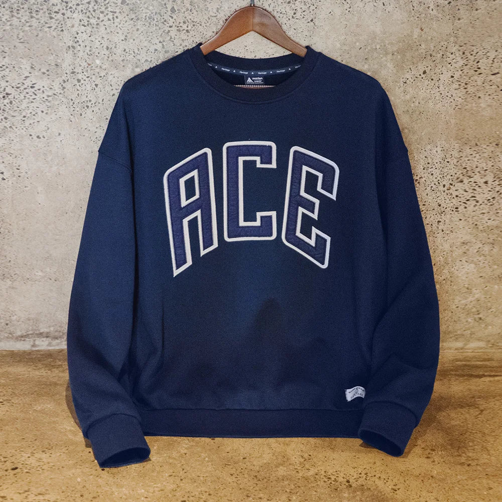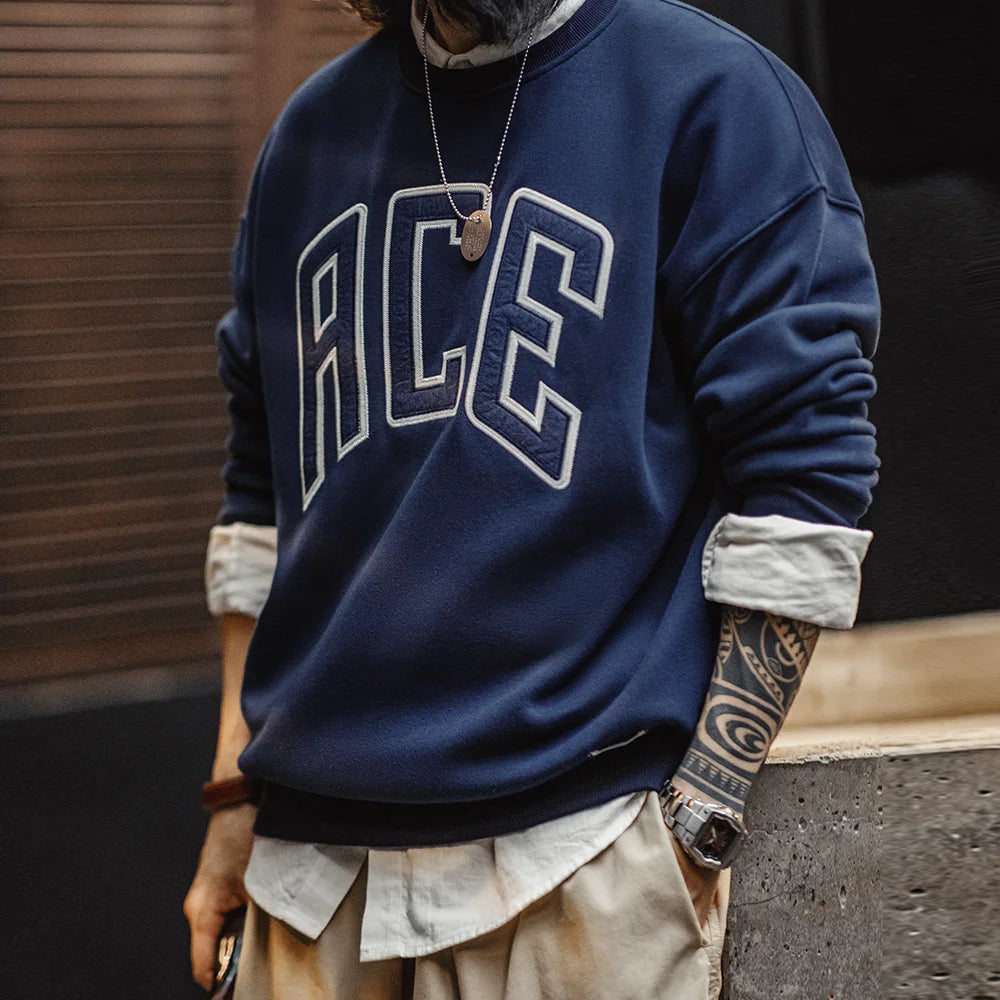 Maden Casual Hoodie with Letter Embroidery Fleece Lining Collegiate Style Sweatshirt Thick Warm Round Neck Tops for Men's Fall