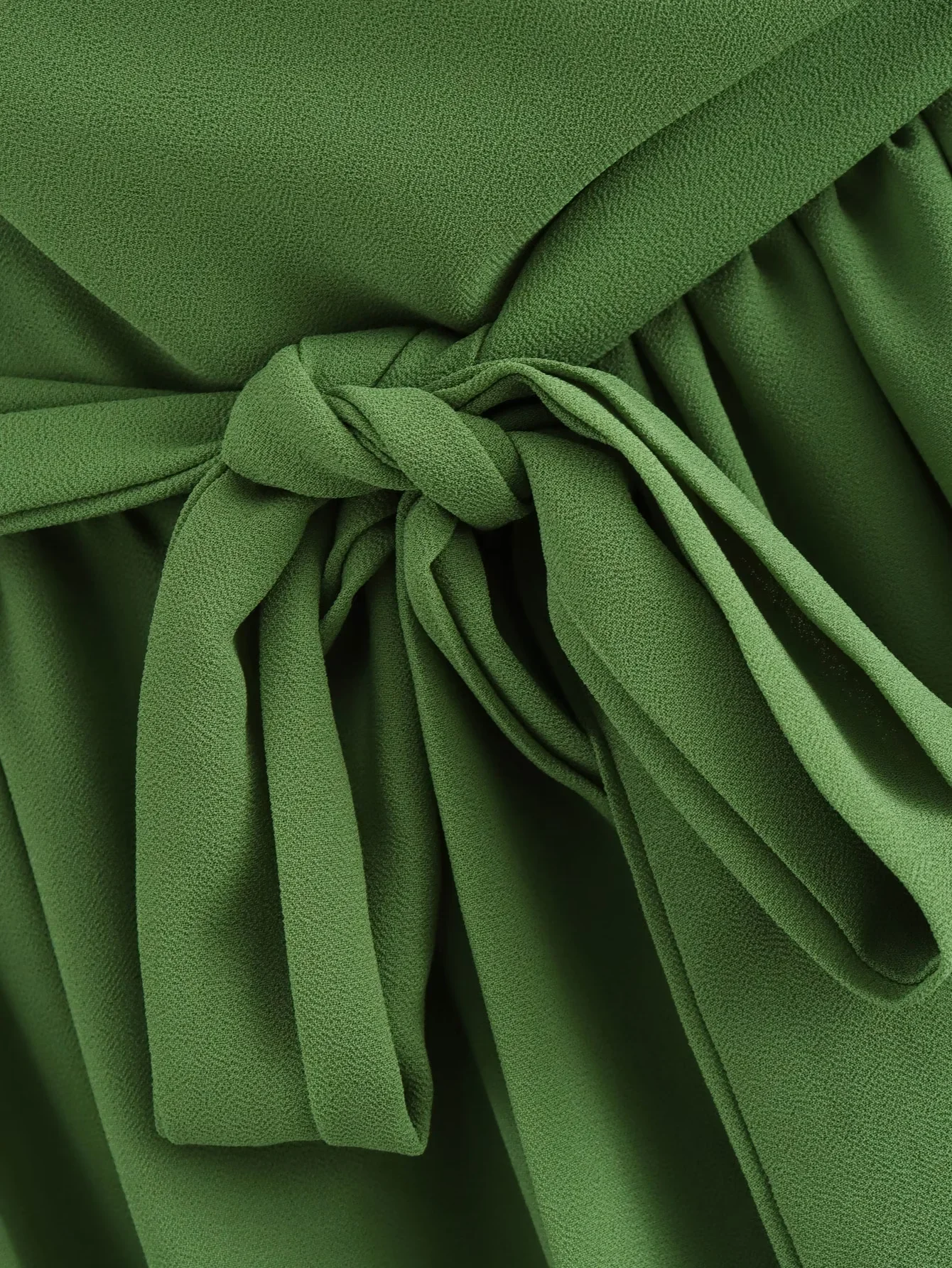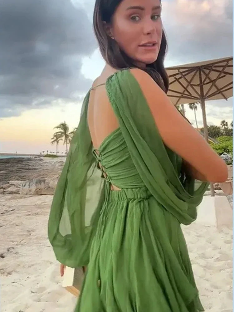 Sexy Green Pleated Mini Dress for Women Elegant V-neck Split Long Sleeve A-line Dresses Summer Lady Solid Backless Lace Up Robes